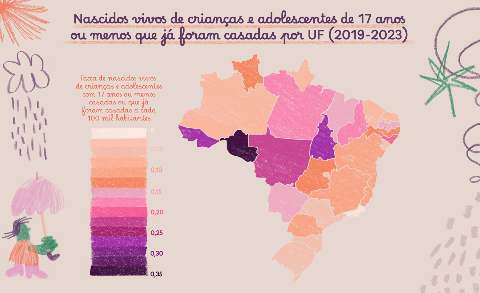 - 34 mil crianças e adolescentes de até 14 anos vivem em união conjugal (o que inclui também os casamentos informais), cuja maioria (70%) é negra, segundo o Censo 2022. São Paulo é o estado com maior número absoluto (4722 pessoas), enquanto o Amazonas apresenta a maior incidência proporcional, com 0,11% das uniões envolvendo pessoas nessa faixa etária.
