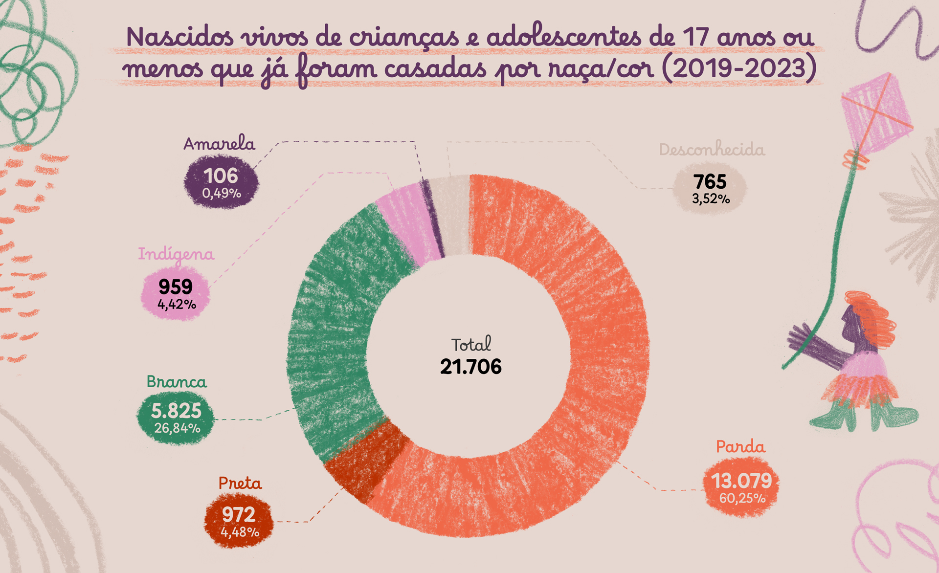 - Entre 2019 e 2023, nasceram 20.903 bebês de crianças e adolescentes casadas e 803 de crianças e adolescentes que já foram casadas (divorciadas, separadas judicialmente ou viúvas).