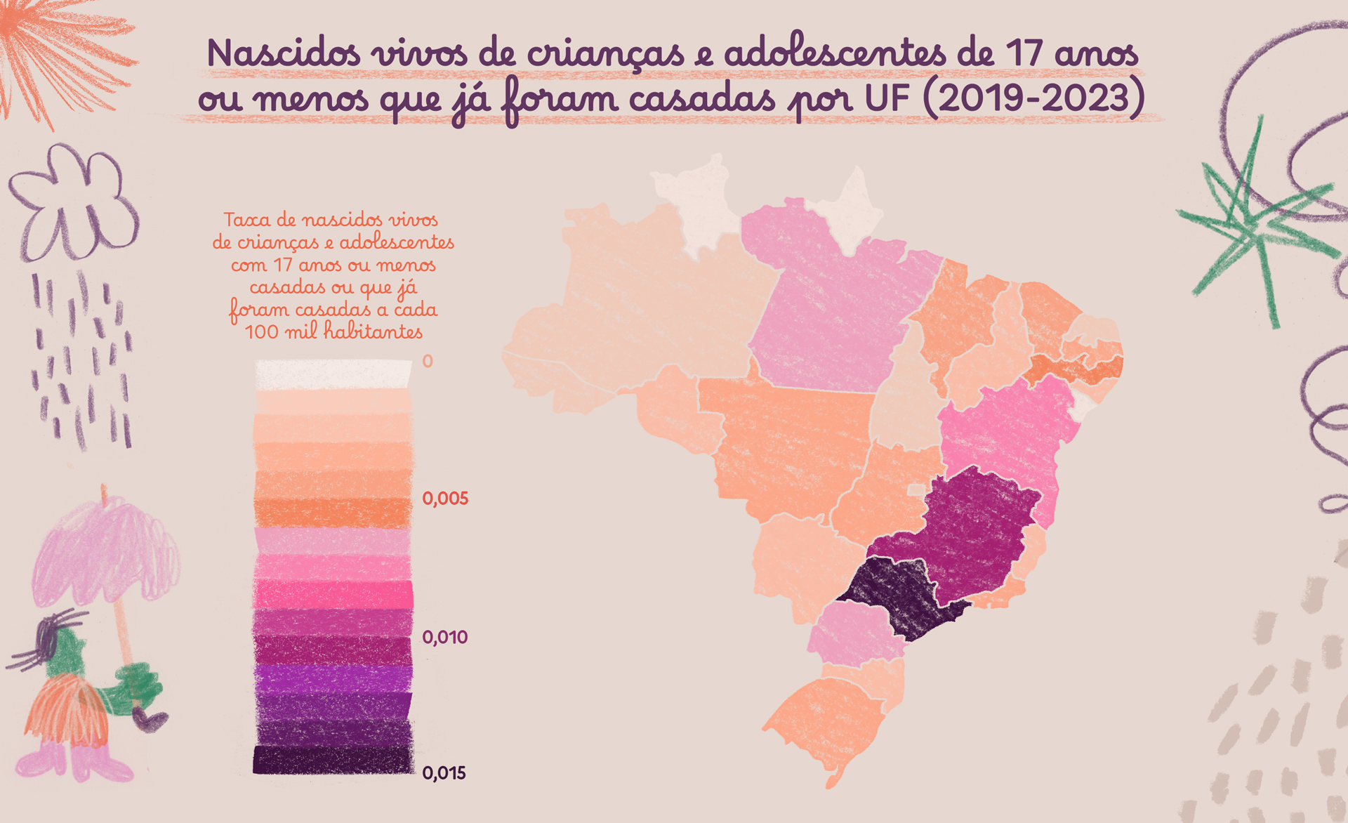 Nos dados do SINAN referentes à violência contra gestantes, foram registradas 15.984 crianças e adolescentes entre 8 e 17 anos solteiras e 3.852 casadas ou que já haviam sido casadas. Trata-se de um número apenas quatro vezes menor, com prevalência de 78,19% de crianças e adolescentes negras, que destaca a desigualdade racial dentro das uniões precoces.