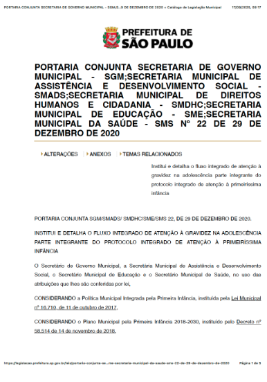 Portaria Conjunta SGM/SMADS/SMDHC/SME/SMS n° 22, de 29 de dezembro de 2020 (institui e detalha o Fluxo Integrado de Atenção à Gravidez na Adolescência parte integrante do Protocolo Integrado de Atenção à Primeiríssima Infância):