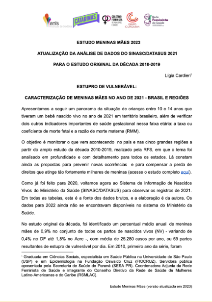 Estudo “Meninas mães 2023: atualização da análise de dados do SINASC/DATASUS 2021 para o estudo original da década 2010-2019”:
