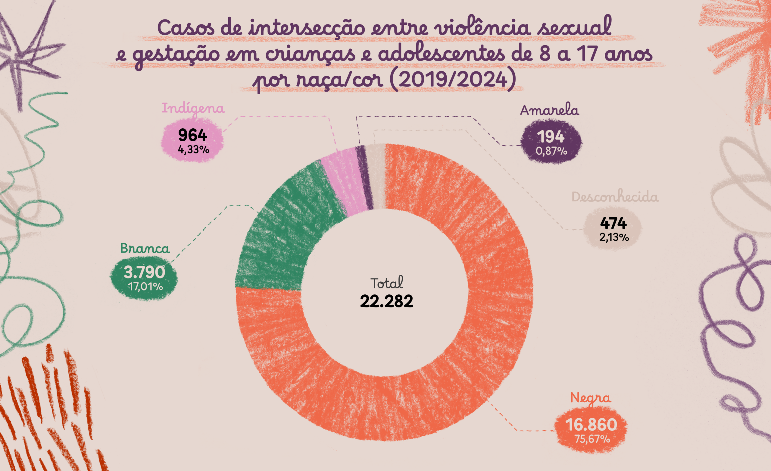 Nos casos em que a violência sexual se intercruza com a gestação, 75,67% das crianças e adolescentes atingidas são negras, 17,01% são brancas, 4,33% são indígenas, 0,87% são amarelas e 2,13% dos dados obtidos não informam raça-cor. Essa informação permite concluir que a gestação decorrente de violência sexual atinge de forma desproporcional a crianças e adolescentes negras.